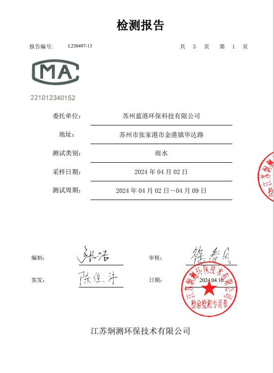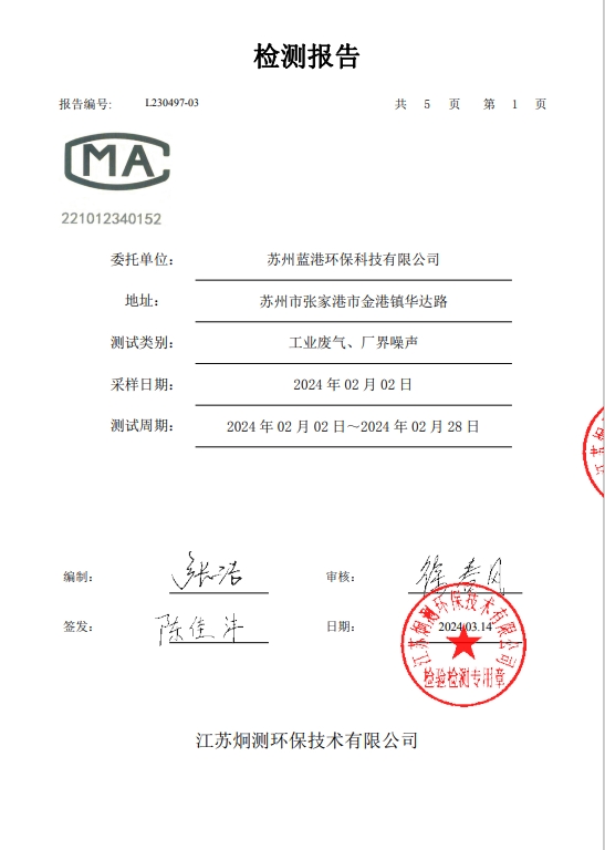 蘇州藍(lán)港環(huán)保科技有限公司檢測報告已公示,詳情請查...